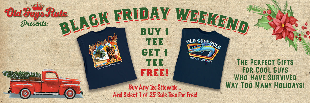 Some love to hang 10, but around here we hang 60 or 70! Old men taught young men how to surf, so why would that stop because we have few gray hairs? Old Guys Rule has a selection of Surf T-shirtsfor sale that show just how rad your dad is. When he is not in the water, he can still represent his surfer lifestyle with Old Guys Rule’s surfer bumper sticker and decals. We'e got surf t-shirts and accessories that make great gifts for any special occasion.