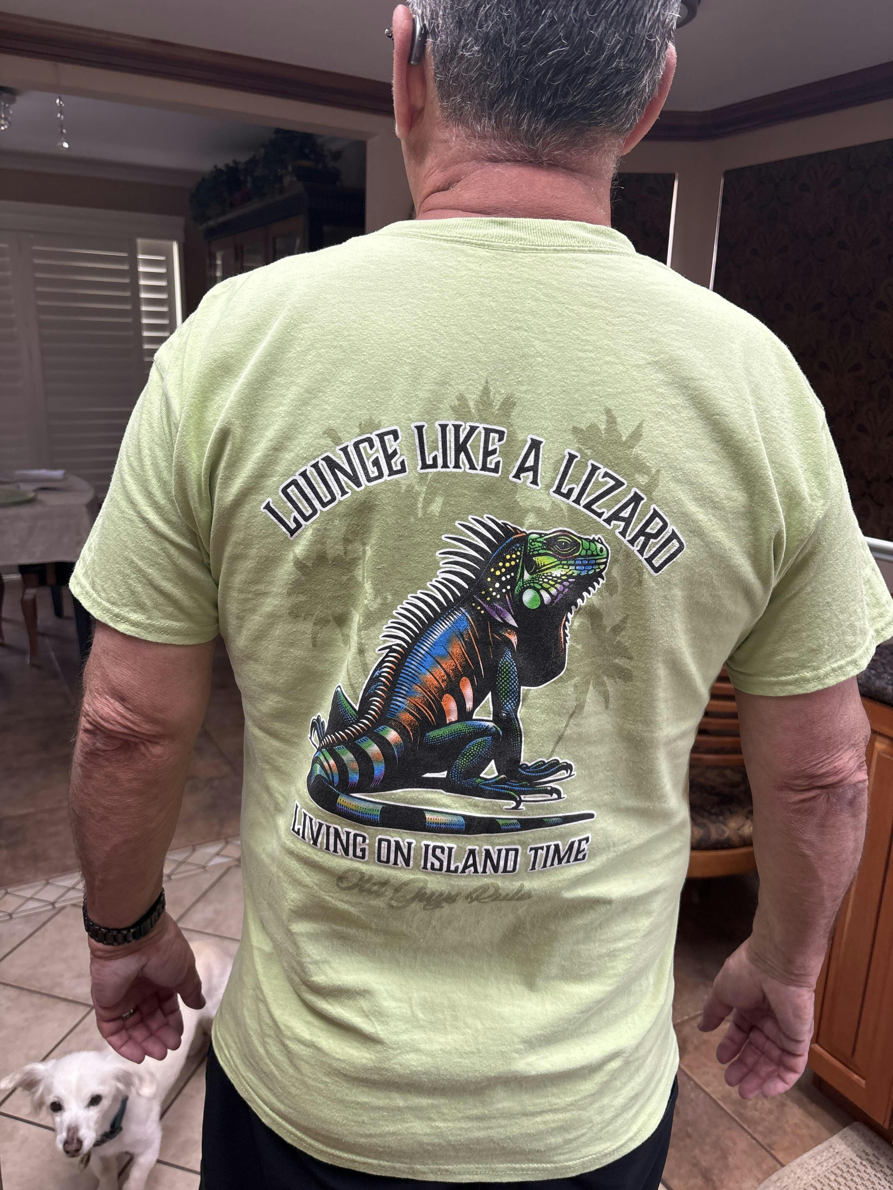 Shirt Text:"Lounge Like a Lizard -Living On Island Time - Old Guys Rule" |